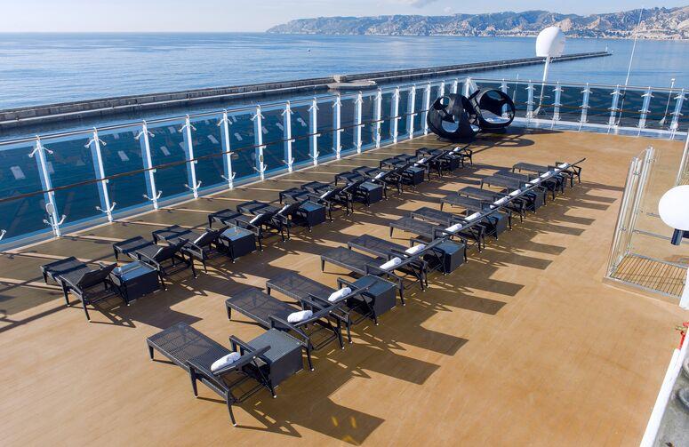 Gemide yolculara MSC Yacht Club yolcularına özel havuz, jakuzi, solaryum ve barın bulunduğu özel güneşlenme terası.